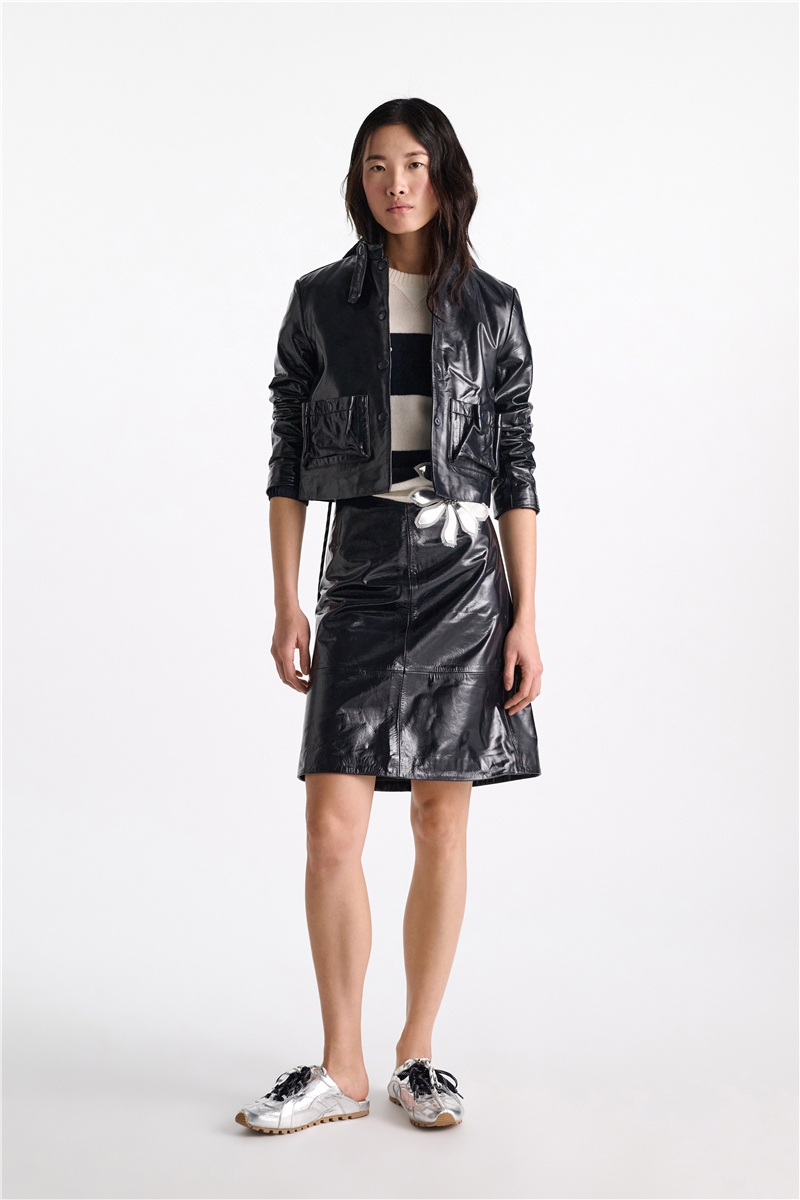 Besonders schön wirkt der Pullover zu einem schmalen schwarzen Rock – kurz oder lang getragen. Ergänzt mit dem silbernen Hüftengürtel von Dorothee Schumacher entsteht ein klarer, moderner Look. Weiße Sneaker bringen eine entspannte Note, weiße Slingbacks unterstreichen die grafische Eleganz des Schwarz-Weiß-Kontrasts.