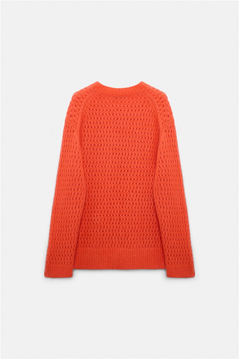 Ein weich fallender Pullover mit luftiger Struktur und entspannter Eleganz. Der offen gestrickte Merino-Kaschmir-Mix fühlt sich besonders leicht an und erhält durch die „Fluffy Knit“-Waschung eine sanfte, voluminöse Haptik. Die lockere Passform und der klassische Rundhalsausschnitt verleihen dem Design eine mühelose Lässigkeit, während die feine Pointelle-Struktur dem Pullover Tiefe und Modernität gibt. In der ausdrucksstarken Farbe Jelly Belly wird das Modell zum bewussten Farbakzent und zeigt die zeitgemäße Strickhandschrift von Dorothee Schumacher.