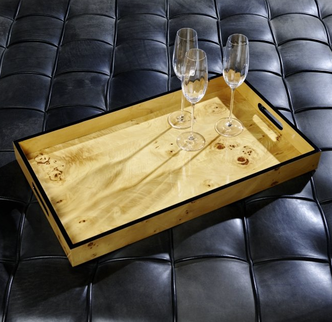 Das praktischen Tablett von LAMBERT wurde aus feinem Wurzelholz gefertigt. Man kennt diese Furniere aus dem Innenraum eleganter Luxus- Limousinen. Hier wird dieses edle Holz in die Interieurteile oder ins Lenkrad eingelegt. Die außergewöhnliche Maserung entsteht durch die Verwendung von Furnieren, die an Baumknollen und Astwucherungen, den sogenannten „Baumperlen“ entstehen. Sechs Lackschichten versiegeln das wertvolle Material.
