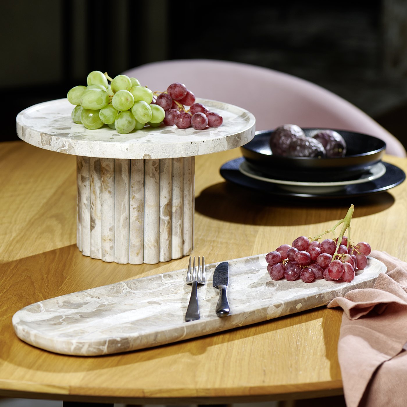 Sehr harmonisch wirkt Anthea zusammen mit der länglichen Marmorplatte von Lambert. Gemeinsam entsteht ein elegantes Arrangement für den gedeckten Tisch – ideal zum Anrichten von Käse, Obst oder Desserts. Auch mit Kerzen oder kleinen Dekorationsobjekten lässt sich die Platte wirkungsvoll inszenieren.