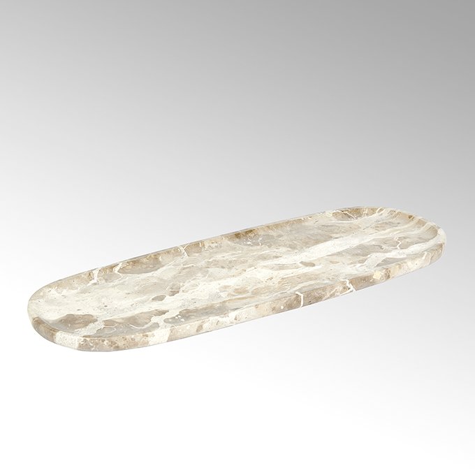 Die längliche Marmorplatte Amos von Lambert verbindet natürliche Materialität mit klarer, ruhiger Form. Aus einem massiven Stück Marmor von Hand geschnitten und geschliffen, entsteht ein Objekt mit individueller Maserung in sandfarbenen Nuancen. Jede Platte zeigt eine eigene Zeichnung und wird so zu einem kleinen Unikat. Die reduzierte Form unterstreicht die elegante Wirkung des Natursteins und macht die Platte zu einem vielseitigen Begleiter – zum Servieren, Präsentieren oder als dekorative Ablage.