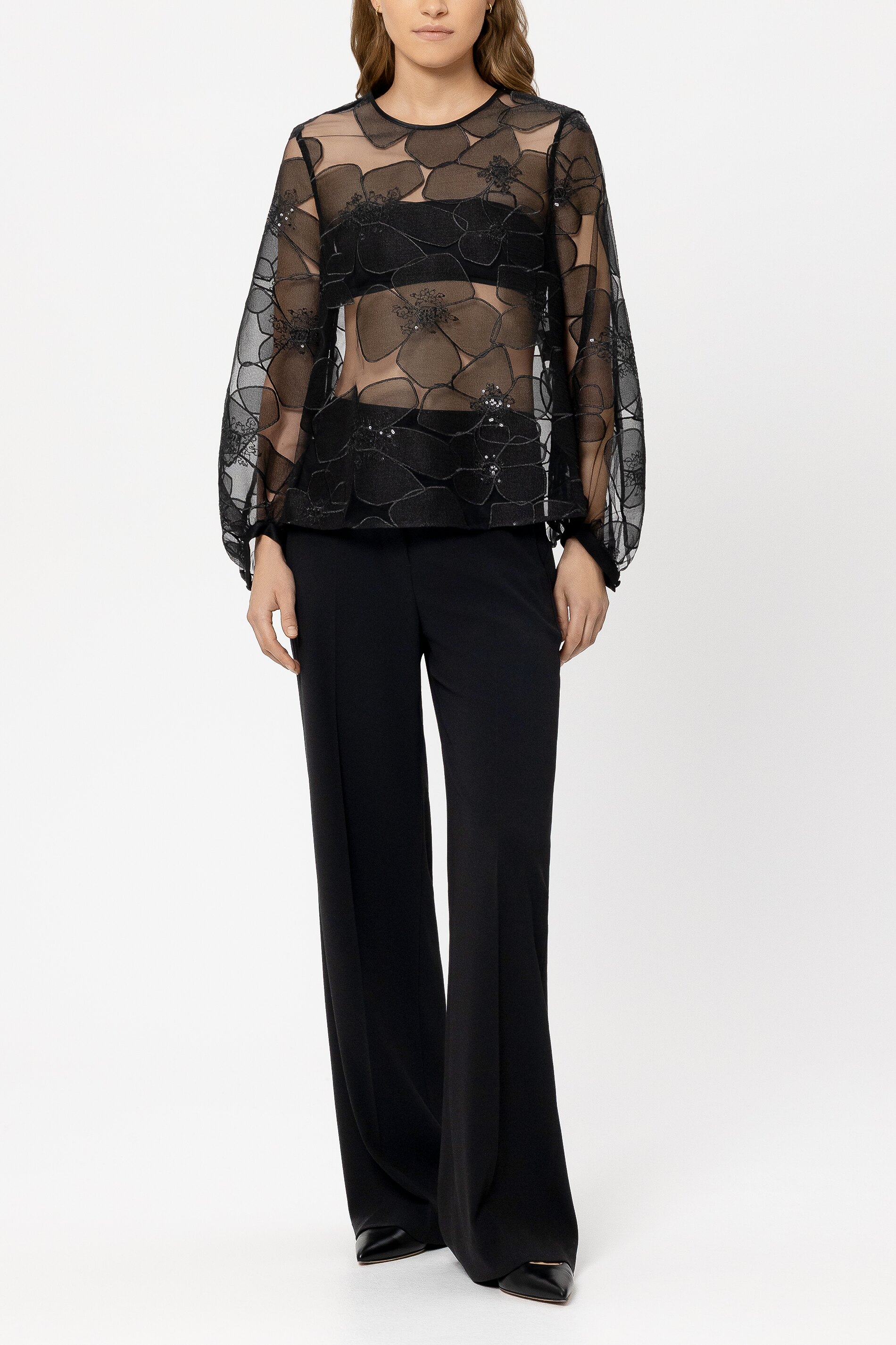 Zarte, transparente Tüllbluse von Luisa Cerano mit aufwendiger Blütenstruktur und funkelnden, aufgestickten Pailletten. Die leicht ausgestellte Silhouette verleiht dem Look feminine Leichtigkeit. Voluminöse Ärmel enden in satinbezogenen Bündchen mit stoffüberzogenem Knopf. Im Nacken setzt ein dezent glänzender Schmuckknopf einen edlen Akzent. Ein außergewöhnliches Statement-Piece für elegante Abendlooks oder moderne, festliche Outfits.