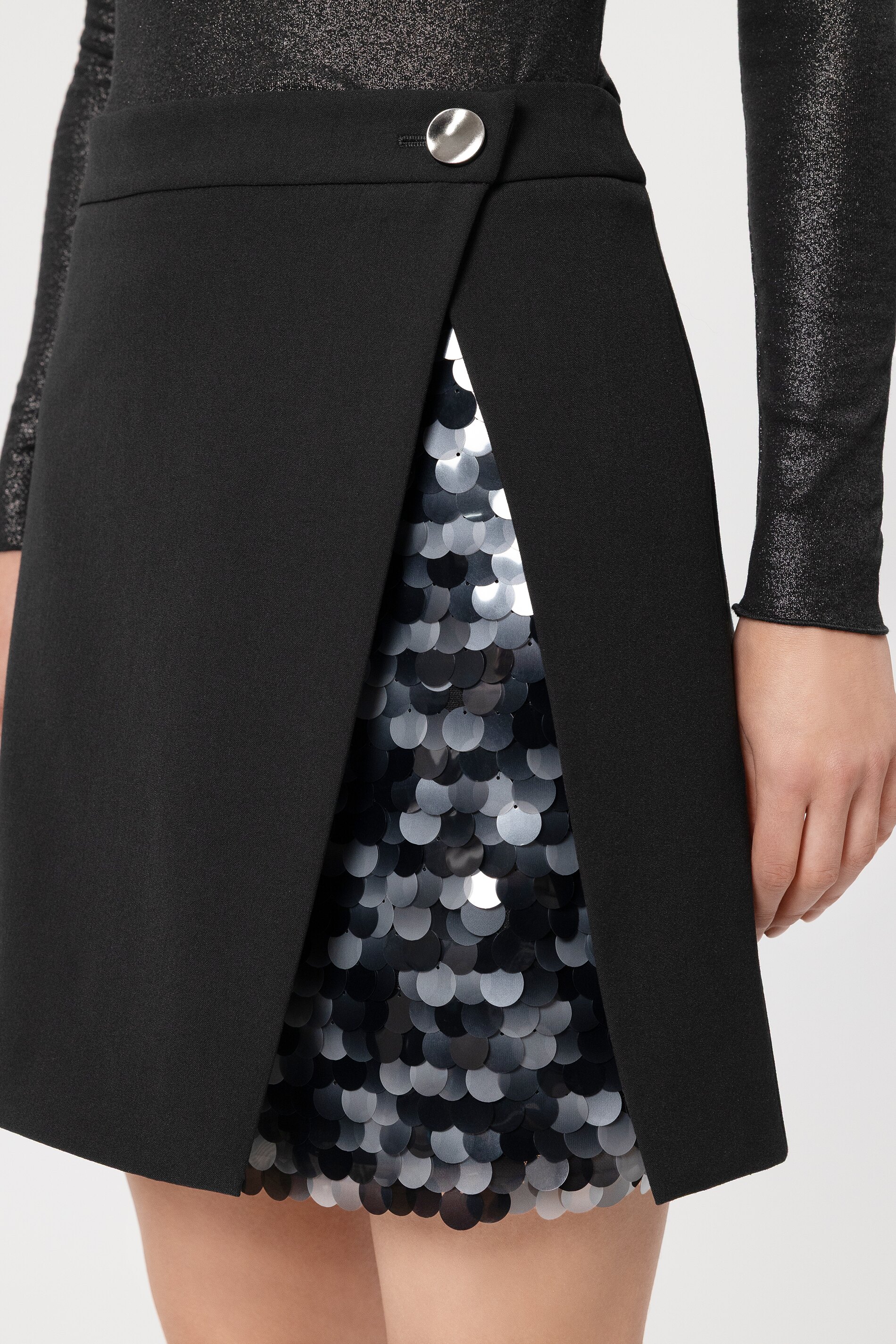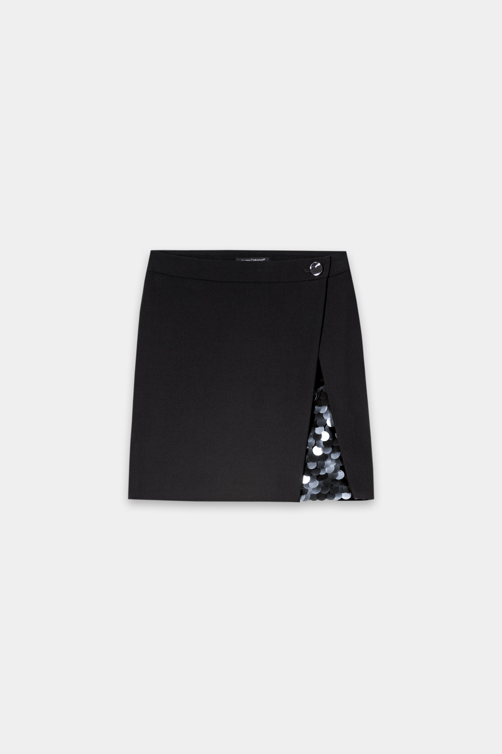 Moderner Minirock von Luisa Cerano aus bielastischer Technowolle in stilvoller Wickeloptik. Die Besonderheit zeigt sich beim Bewegen: Der vordere Innenstoff ist aufwendig mit großen, glänzenden Pailletten besetzt und blitzt raffiniert durch den seitlichen Überlappungseffekt hervor – ein echter Hingucker für besondere Anlässe. Der Rock wird oben am Bund mit einem Knopf sowie einem zusätzlichen Innenknopf sicher geschlossen. Ein hochwertiges, elastisches Material sorgt für eine perfekte Passform und hohen Tragekomfort.