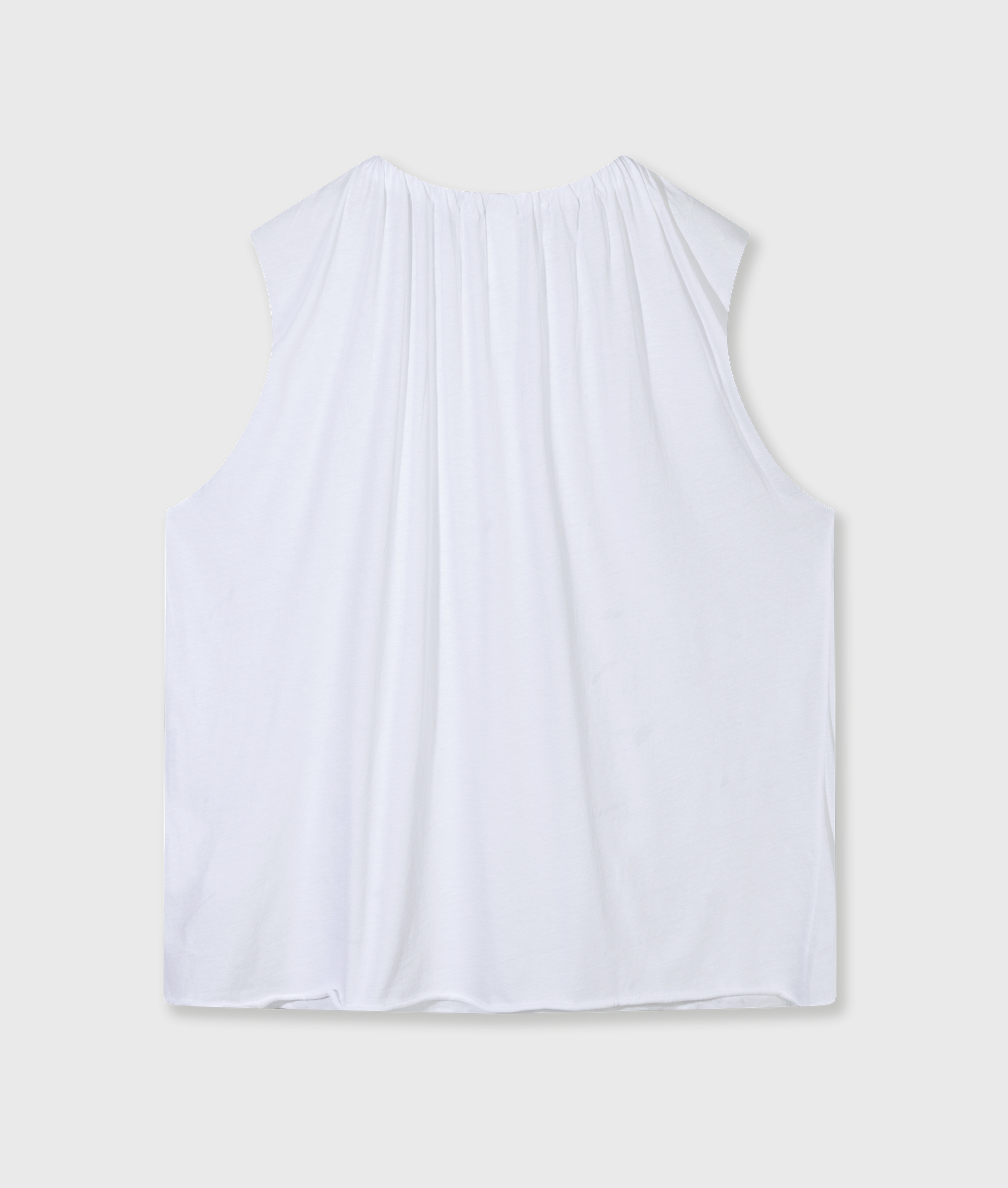 Ein ärmelloses Top in klarer, fließender Silhouette, das durch seine feine Struktur und die ruhige Leichtigkeit besticht. Der gesmokte Rundhalsausschnitt erzeugt eine sanfte Weite, während die offenen Abschlüsse den entspannten Charakter unterstreichen. Gefertigt aus GOTS-zertifiziertem Bio-Baumwolljersey, verbindet das Design von 10 DAYS mühelose Modernität mit einem angenehm soften Tragegefühl.