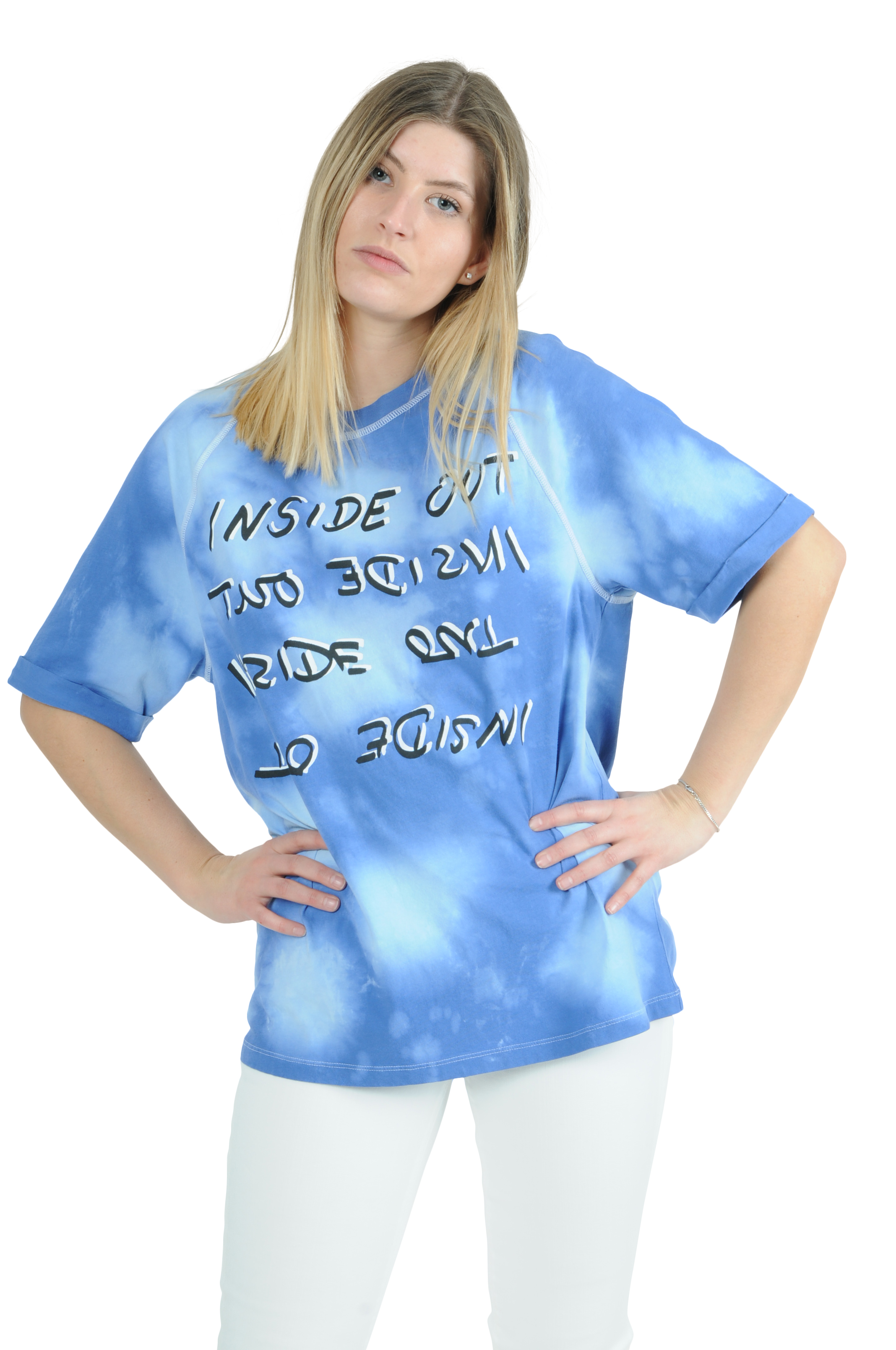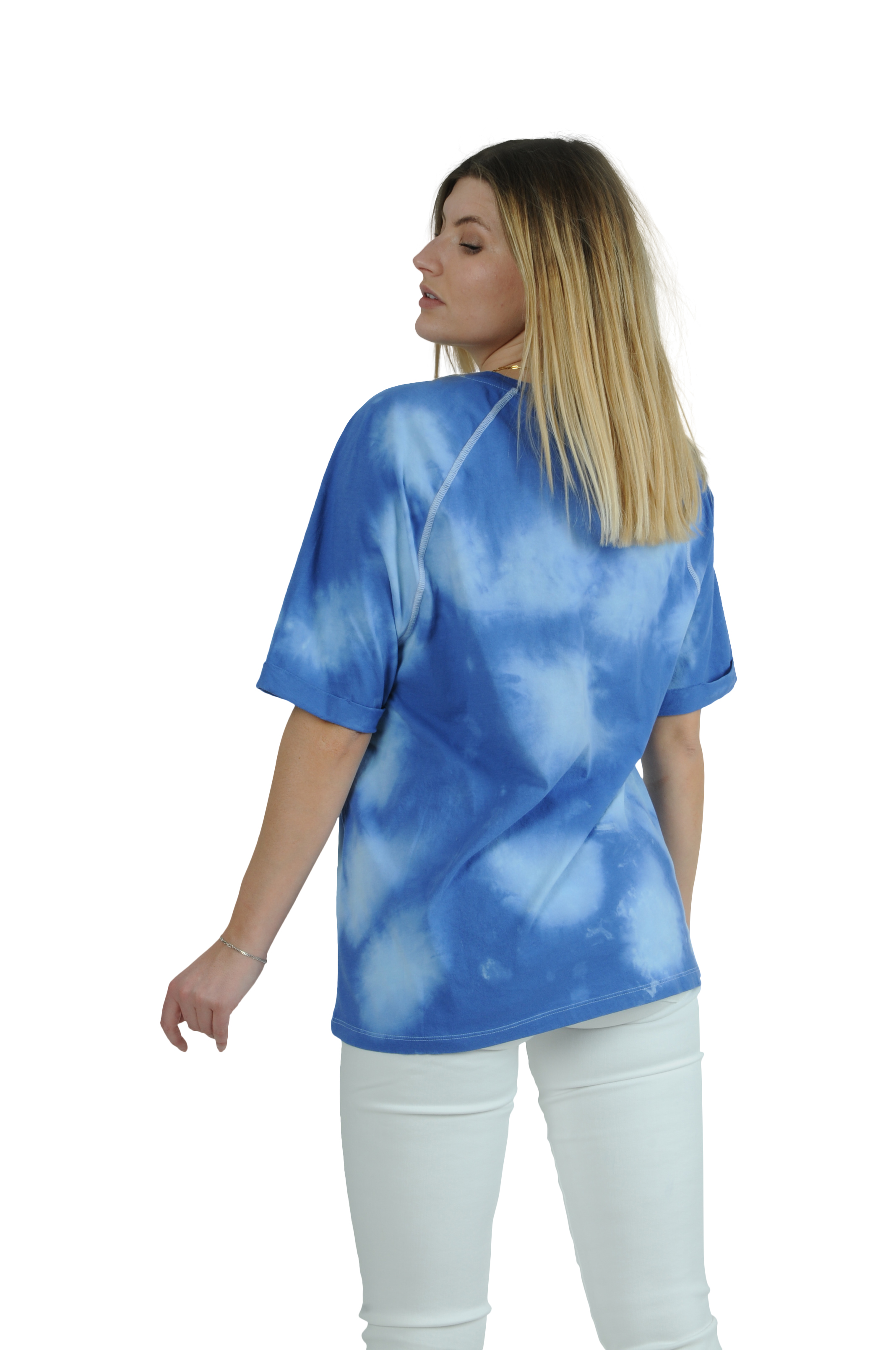 Boyfriend T-Shirt von LALA BERLIN in einem kräftigen blau mit Tie-Dye Effekt und Slogan Print