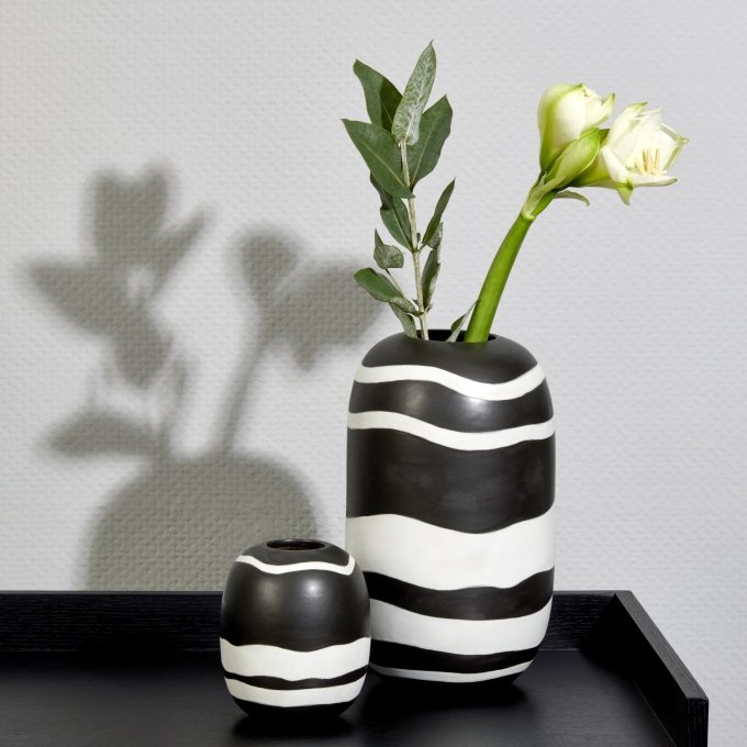 Bei einem gemütlichen Spaziergang am Fluss entlang wandert der Blick auf die vielen rund geschliffenen Kieselsteine, die man gerne in die Hand nimmt. Als Handschmeichler findet der ein oder andere so auch häufig seinen Weg in das eigene Zuhause. Das Gefäß Azuki von LAMBERT nimmt sich dieser natürlichen Formensprache an und ist ein echter Hingucker, der in Ihrem Wohnambiente besondere handwerkliche Akzente setzt. Azukis schwarz-weiß kontrastierende Linien sind den unregelmäßigen Wellen im Flussbett nachempfunden. Die handgefertigte Verarbeitung und die individuelle Glasur machen jedes Stück zu einem Unikat. Azuki setzt Frisch- und Trockenblumensträuße besonders schön in Szene. Da Keramik aufgrund ihrer natürlichen Beschaffenheit grundsätzlich Wasser aufnimmt und speichert, empfehlen wir, bei Verwendung von Frischblumen ggf. einen Glaseinsatz oder einen Untersetzter zu verwenden. Azuki nur von Hand mit warmem Wasser reinigen. Keine scheuernden Schwämme nutzen.