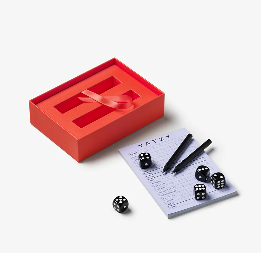 Endecken Sie eine moderne Variante Ihres beliebten Yatzy-Spiels von PRINTWORKS, bei der Ästhetik auf Unterhaltung trifft. Unser Yatzy Classic enfällt fünf schwarze Würfel, zwei schwarze Bleistiffte und eine 50-seitige Punktekarte. Es verfügt über leicht verständliche englische, französische und deutsche Anweisungen und ist für 6 Spieler ab 4 Jahren geignet.