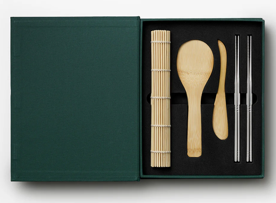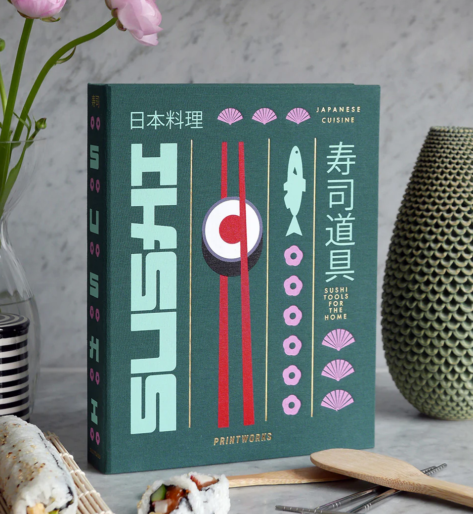 Endecken Sie unser Essential Kit für Sushi-Abende von PRINTWORKS, geschickt getarnt als elegante buchänliche Box. Beim Öffnen endecken Sie alle wichtigen Werkzeuge für ein erfolgreiches Sushi-Abenteuer. Ale Werkzeuge sind aus rostfreiem Stahl und spülmaschinenfest.