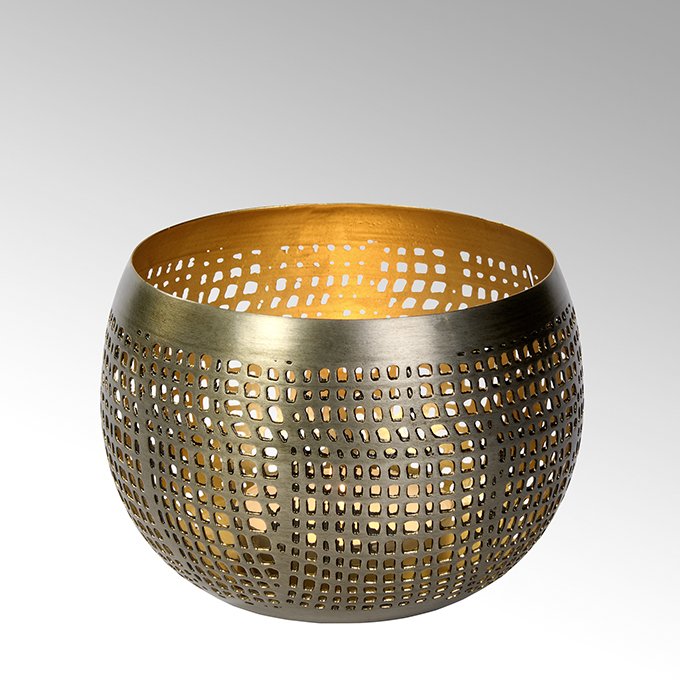 Das dekorative Windlicht Abaye von Lambert zaubert eine besonders schöne Atmosphäre in jeden Raum. Die feine grafische Struktur des Korpus lässt das Licht der Kerze sanft hindurchscheinen und erzeugt faszinierende Licht- und Schattenspiele auf Boden und Wänden. Gefertigt aus feinem Eisenblech, verbindet das Windlicht kunstvolles Design mit handwerklicher Präzision. Die patinierte Oberfläche in Antiknickel-Gold sorgt für einen edlen Look und macht jedes Stück zu einem kleinen Unikat.